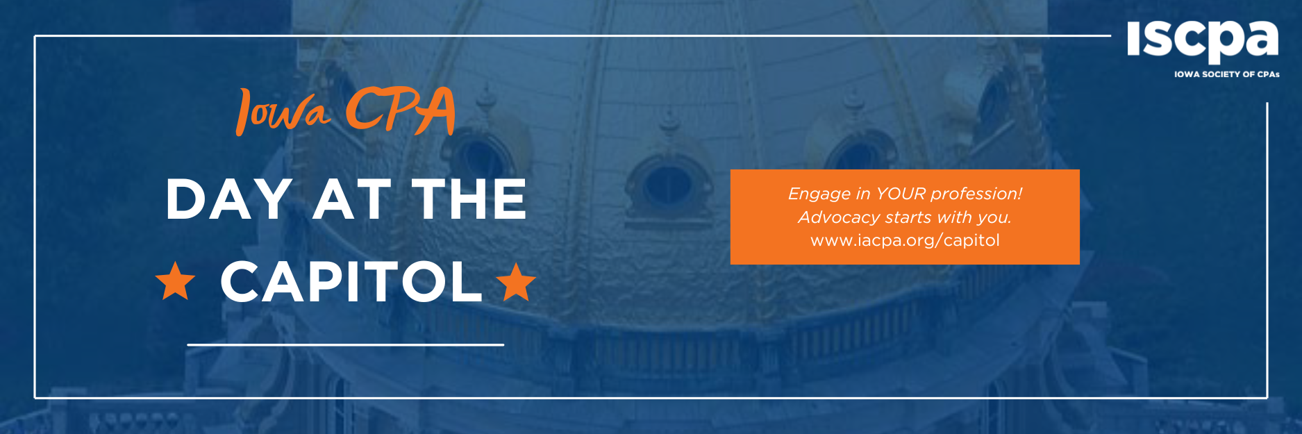 Strong connections with our state and local elected leaders are at the heart of ISCPA’s advocacy work, and Iowa CPA Day at the Capitol is your chance to be part of that impact. Join fellow CPAs for an up-close look at how decisions are made at the Capitol while helping Iowa lawmakers better understand the challenges and opportunities facing the profession.